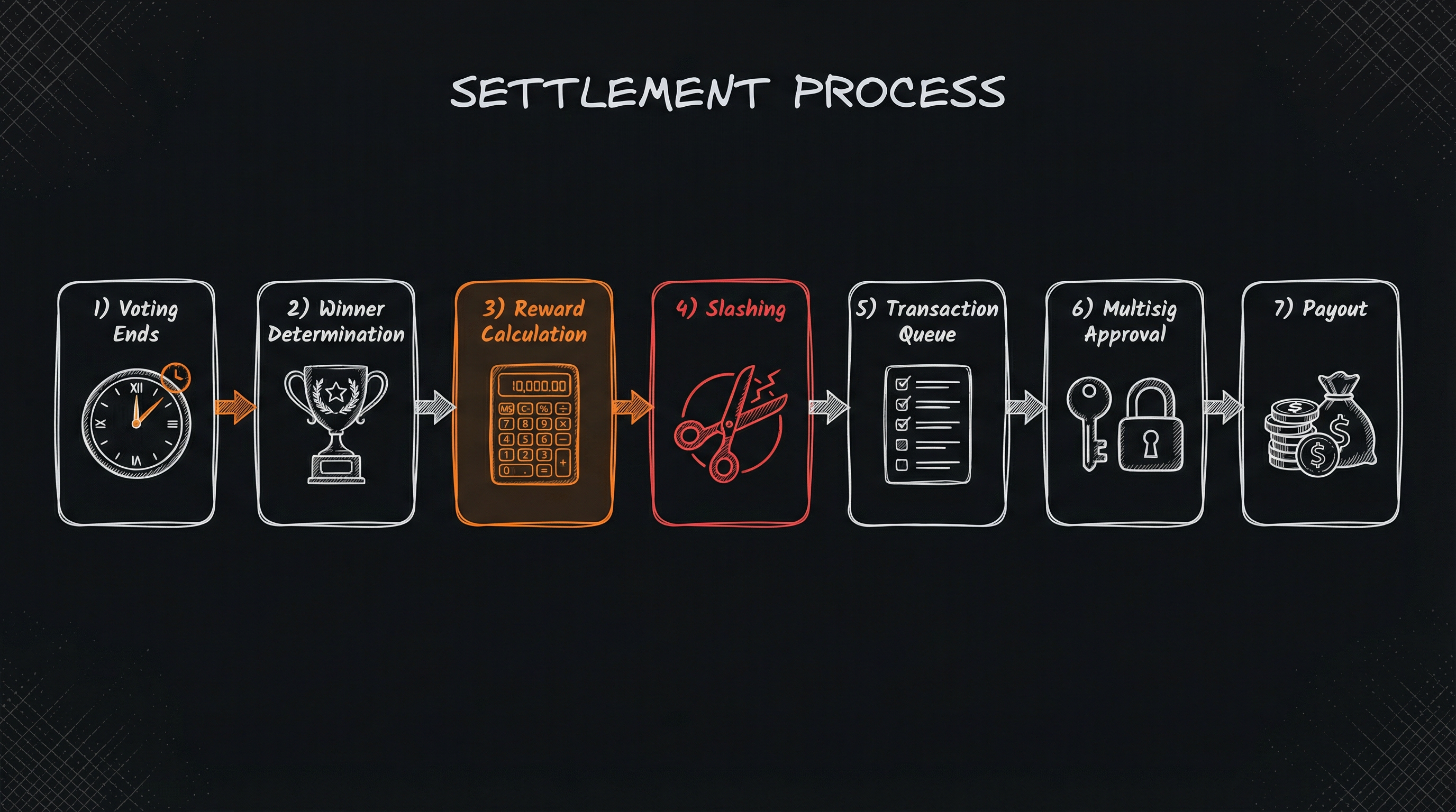 When voting ends, settlement automatically calculates who won, how much everyone gets, and queues transactions for payout. This guide explains what happens behind the scenes.