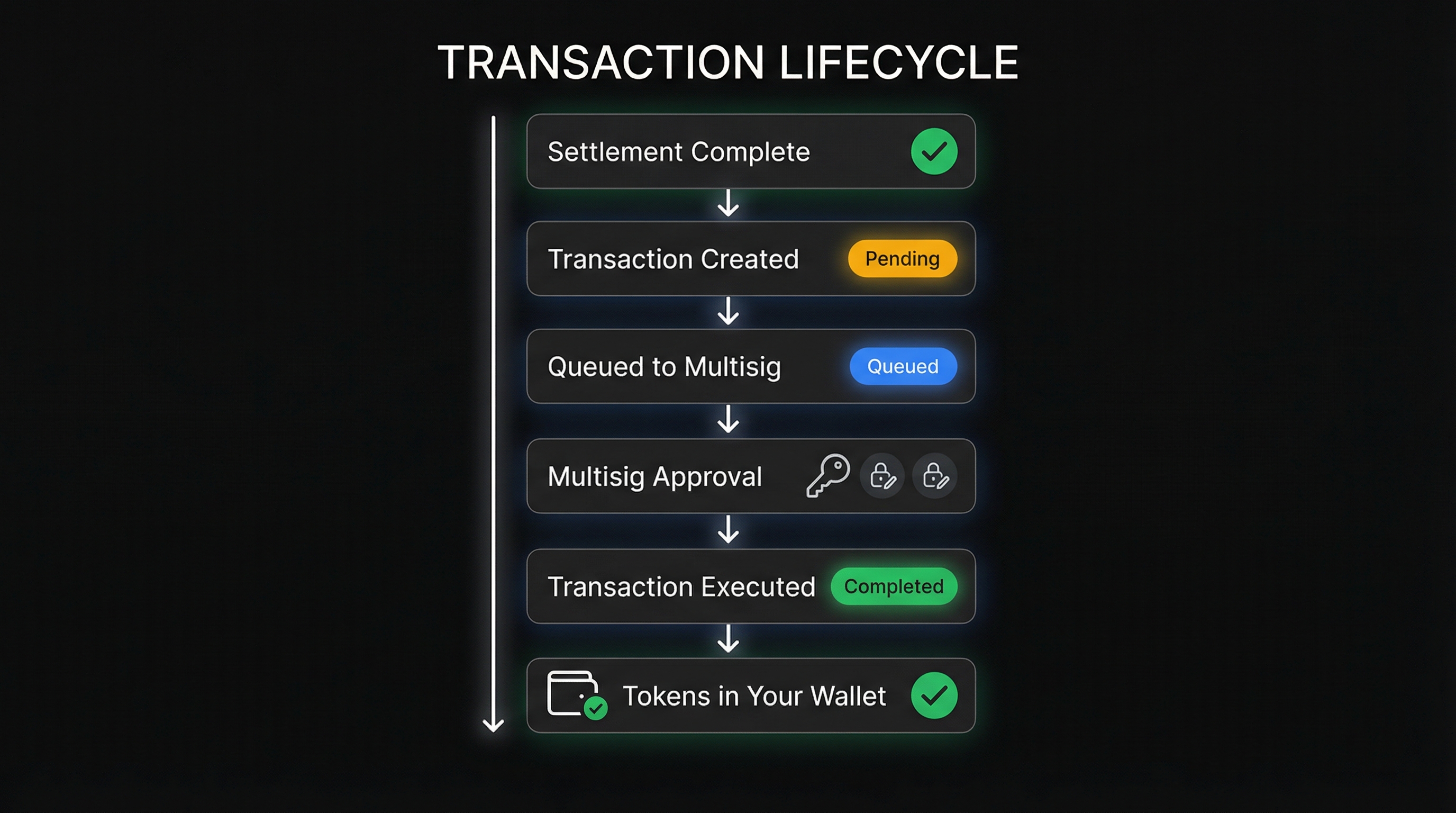 If you're using automatic distribution, transactions get queued in your multisig (Safe or Squads). If manual, they're created with "pending" status for you to review first.