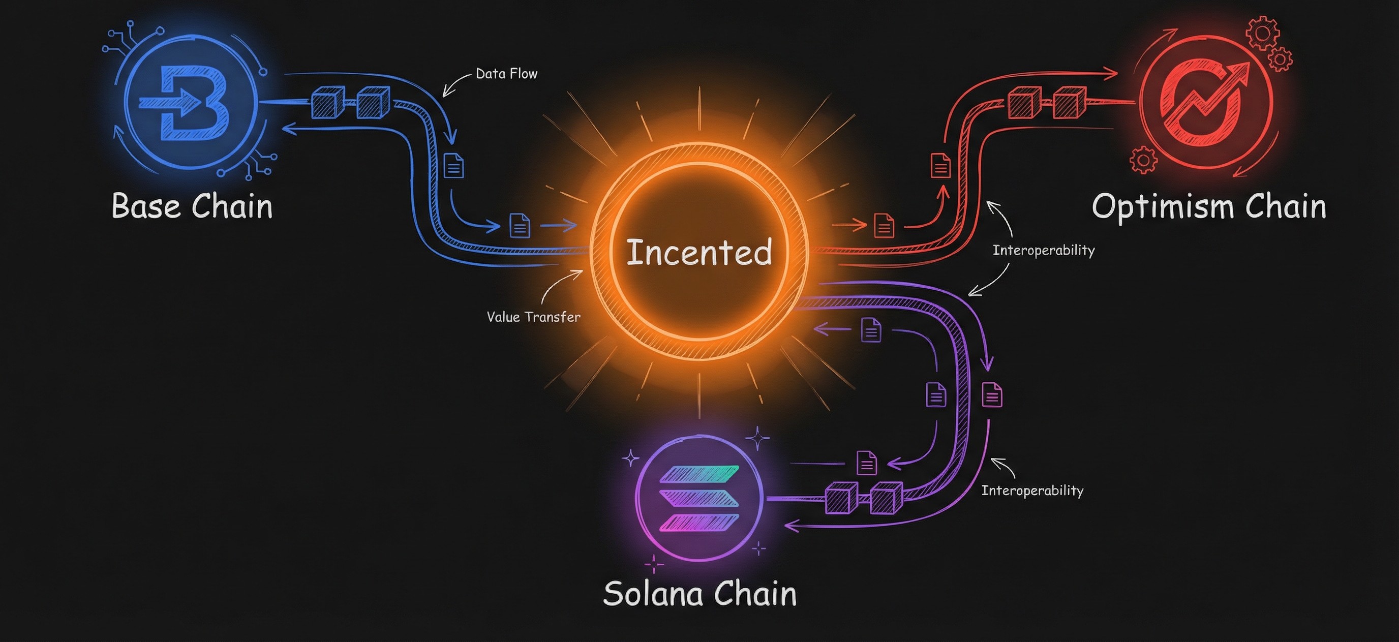 Incented supports EVM chains (like Base and Optimism) and Solana. EVM chains share Ethereum's technology, so one wallet works across all of them.